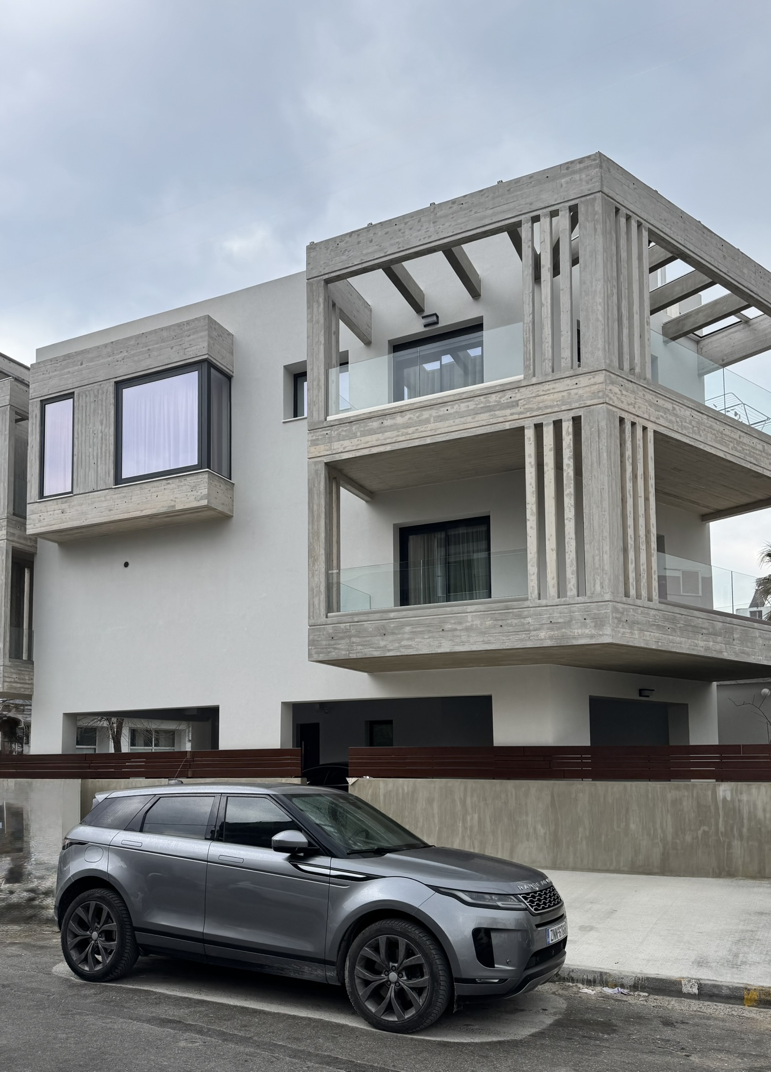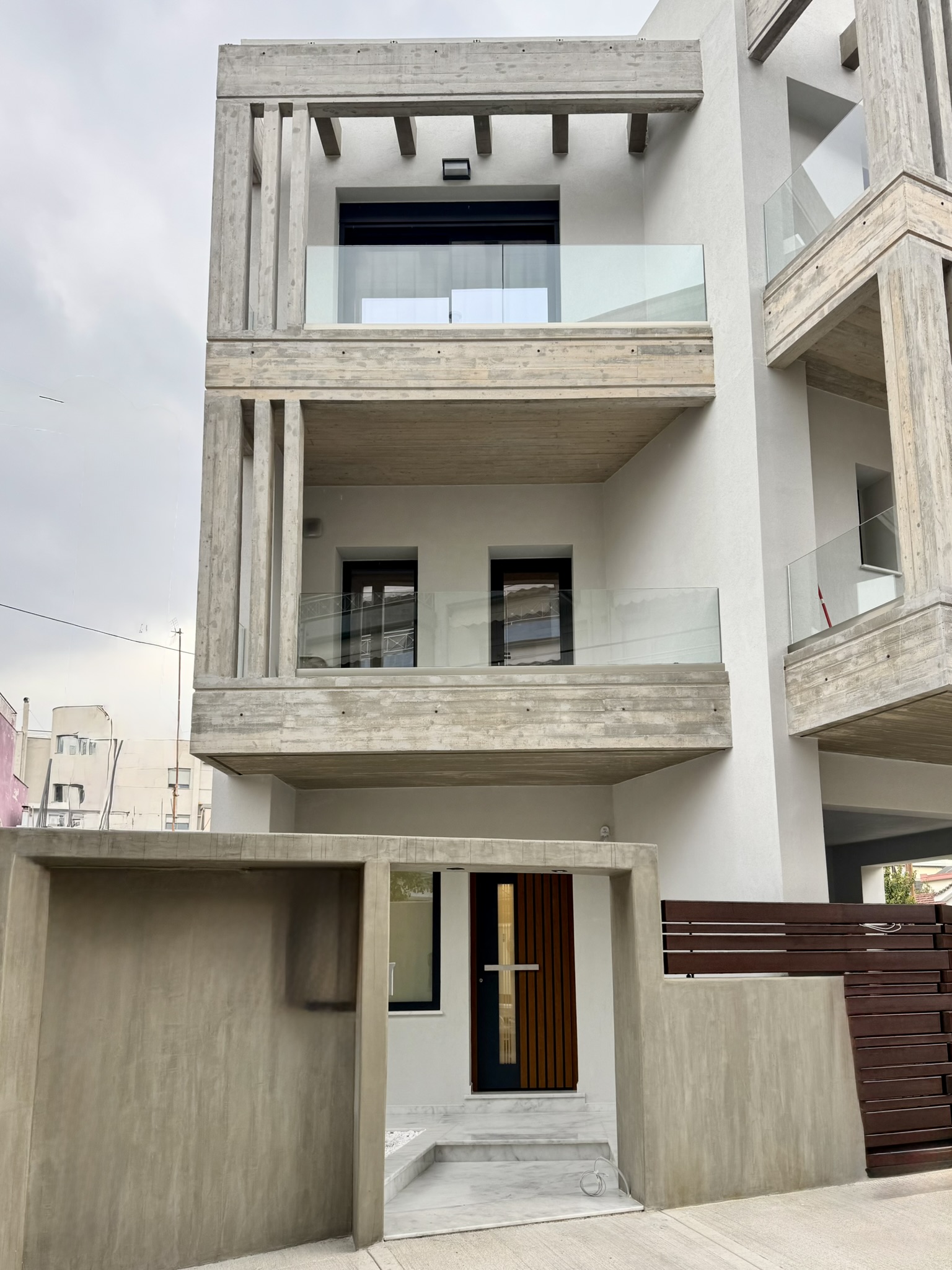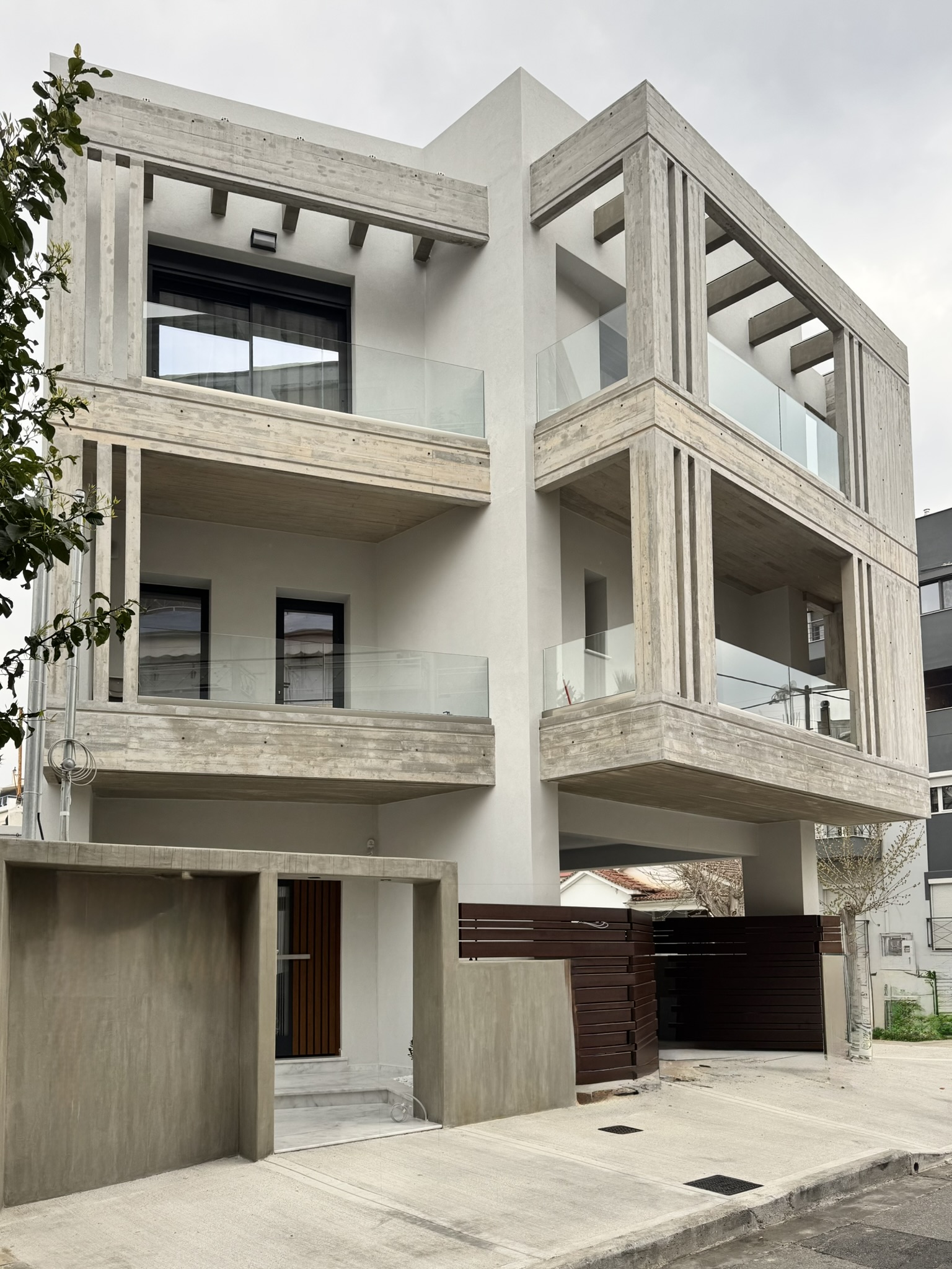 Έχοντας ως σημείο εκκίνησης έναν τραπέζιο οικόπεδο, το κτίριο καθώς εξελίσσεται αποκτά μία παρόμοια τρισδιάστατη ανάπτυξη. Επιχειρείται να μην επιβληθεί στο περιβάλλον αστικό τοπίο αλλά αντίθετα να προσφέρει στην αρχιτεκτονική ποικιλομορφία της περιοχής. Σημαντικό στοιχείο της σύνθεσης αποτελεί ο τρόπος έδρασης του κτιρίου στο έδαφος, ο οποίος προσδίδει μία οπτική ελάφρυνση στον κύριο όγκο χάρη στα ελεύθερα υποστυλώματα του ισογείου στα οποία στηρίζεται. Ολοκληρώνοντας την ογκοπλασία, οι εξώστες με τις πέργκολες και τα κατακόρυφα σκίαστρα με τις σχισμές όπως και το έρκερ τα οποία κατασκευάστηκαν με τεχνοτροπία εμφανούς σκυροδέματος, τονίζουν το περίγραμμα του κτιρίου εμπλουτίζοντας τη χωρική εμπειρία που προσφέρει η κατοικία.